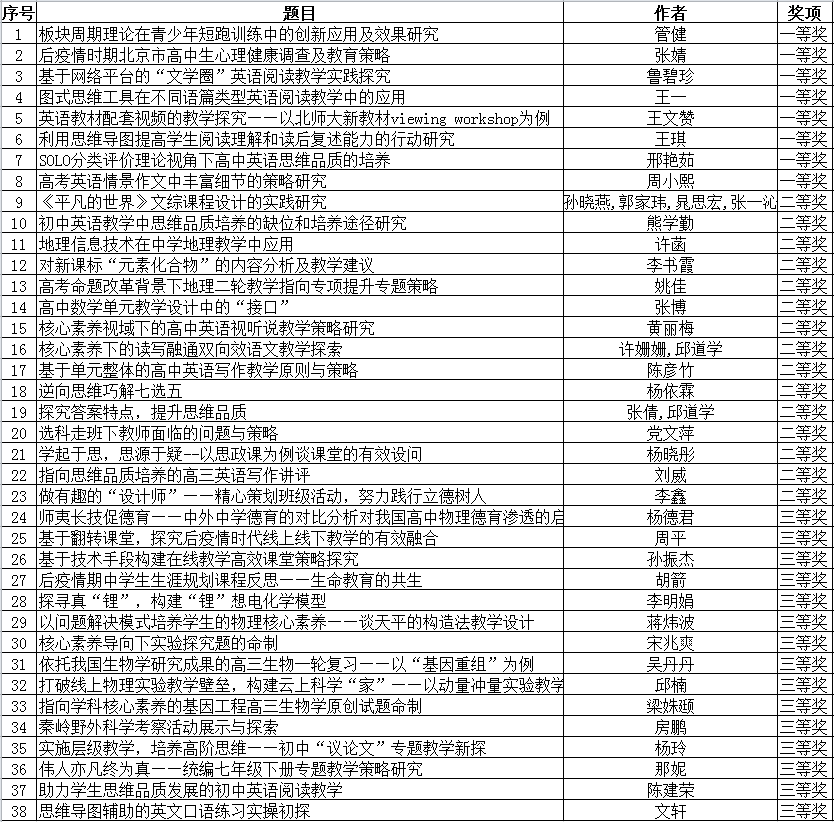 2021年11月10日,海淀区第十七届教育科研优秀论文评选结果揭晓,澳门博彩在线共有38篇教师论文获奖,其中,8篇获一等奖,15篇获二等奖,15篇获三等奖。