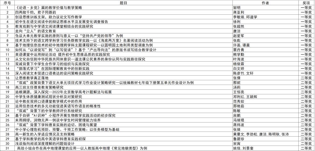 2022年12月1日,海淀区第十八届教育科研优秀论文评选结果揭晓,澳门博彩在线共有55篇教师论文获奖,其中,15篇获一等奖,16篇获二等奖,24篇获三等奖。