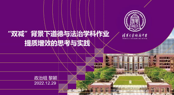 论文年会一等奖获得者黎颖老师做了题为《“双减”背景下道德与法治学科作业提质增效的思考与实践》的分享,从学科作业的设计原则、实施策略两方面梳理了自己如何在双减背景下提质增效,在落实课标要求的同时反映学业质量,坚持立德树人的同时凸显育人功能,促进知行合一的同时培养核心素养。