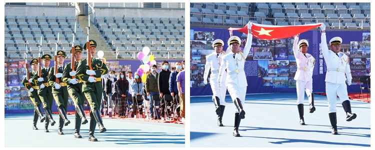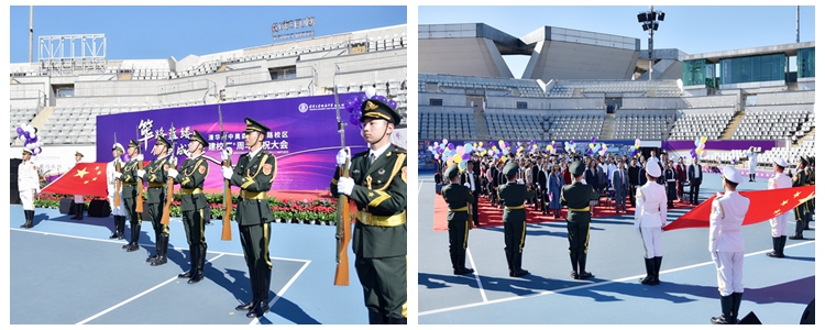 在将台路校区国旗护卫队护送下,伴随着国歌声响起,鲜艳的五星红旗迎风飘扬在映月球场上空。