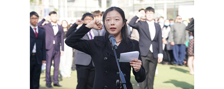 迎着和煦的春风,踏着整齐的步伐,国旗仪仗队缓缓地向舞台走来。与会者高唱国歌,嘹亮的歌声在校园中回荡。