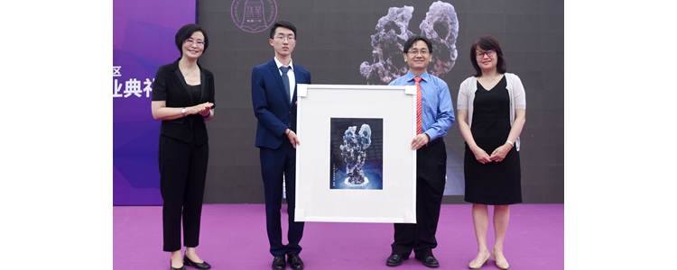 郑星宇同学(左二)代表全体2019届学生向母校赠礼,以表达对母校的报答与感恩