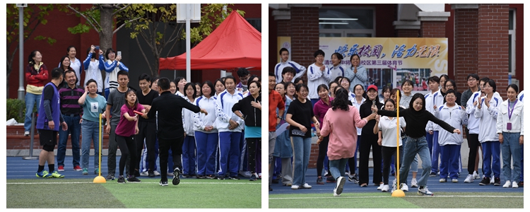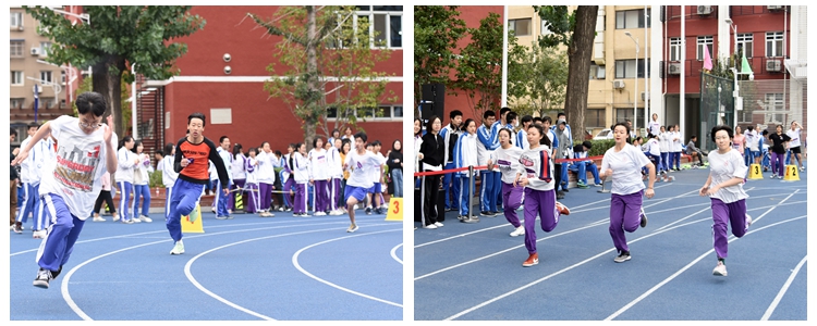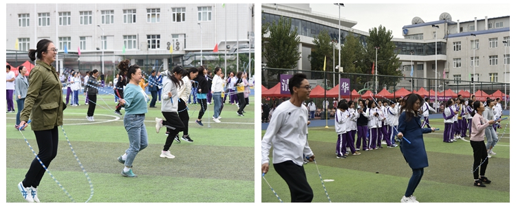 4×100米的呼声还未消散,教师运动会在操场中央拉开序幕,引来了全体学生的加油和助威。比赛分为个人项目跳绳和以年级组为单位的接力跑。场上老师奋勇拼搏,分秒必争,场下学生们加油助威,呼声雷动。