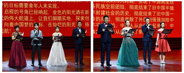 在大型管乐合奏《红旗颂》气势恢宏的旋律中,文艺汇演拉开序幕。演出以中国共产党从抗战时期至今的奋斗历程为主线,分为“硝烟篇:峥嵘岁月、奋斗篇:中国新生、开放篇:伟大转折、辉煌篇:中国梦”四个篇章,通过歌舞、朗诵、器乐、情景表演等舞台手段,再现一代又一代中华儿女为民族独立、国家富强不懈奋斗的伟大历程。整场演出以朗诵串联,师生组合董薇、于平、王潇、林一峥、王勃、陈艳、翟东方、陈柯彤、冯硕、马小艺、刘蕾、吴天昊共同进行主题朗诵。