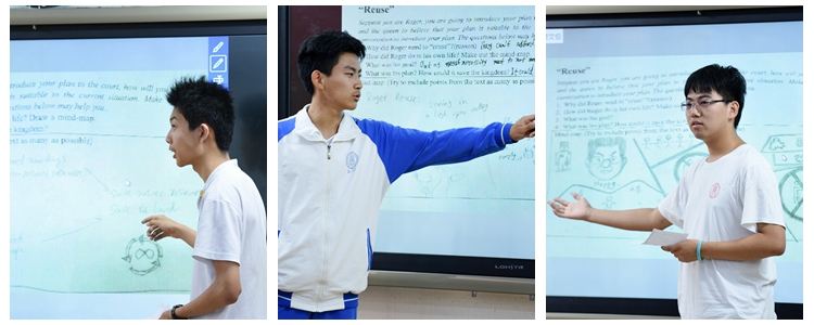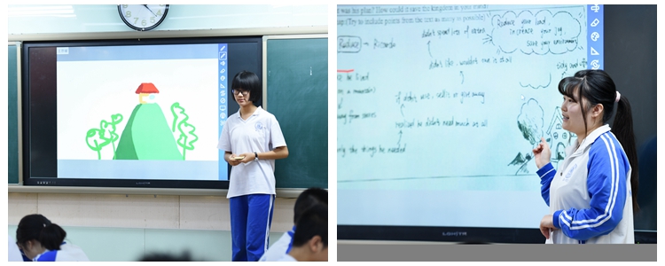 朱建宏校长致欢迎词后,杜文站老师讲授阅读课。课堂充分体现了“雪地阅读”在英语听读、跟读以及词汇教学方面的优势。老师在课堂初期引导学生在“雪地阅读”的平台上通过听读和跟读的方式出声阅读,学生遇到陌生词汇后,可点击该单词查询读音和中文释义。随后学生大声朗读,检查成果,大大提高了读音和词汇教学的效率。此外,在引导学生深入了解整个故事后,杜老师指导学生以小组合作的方式在Pad上画出基于文本的思维导图,并将各小组的成果呈现在大屏幕上,邀请小组上台做演讲。学生在做了充分的准备后,在台上展示自如,落落大方,甚至可以进行创造性地表达。