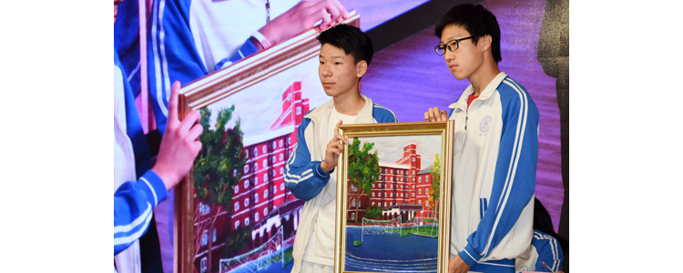 朱建宏校长(左1)、程惠云副校长(右1)为初三年级中外戏剧展获奖代表颁奖