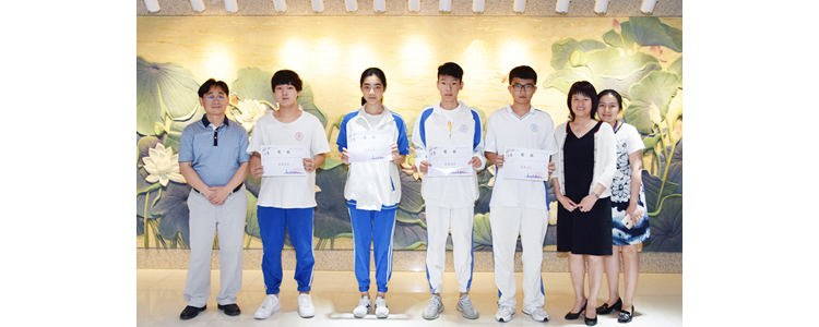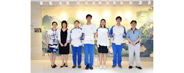 朱建宏校长(左1)、程惠云副校长(右2)、董薇主任(右1)为学生讲座获奖代表颁奖