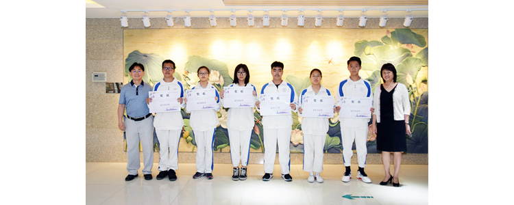 朱建宏校长(右1)、程惠云副校长(左2)、董薇主任(左1)为高一年级中英文艺术节文艺汇演活动获奖代表颁奖