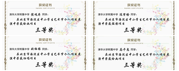 2017年12月22日,北京市海淀区中小学生艺术节个人项目展演成绩公布。澳门网上博彩奥森、将台路校区共19名学生在绘画、独奏、独唱、独舞、摄影、软笔书法等艺术项目中荣获多项荣誉,包括一等奖6名,二等奖5名,三等奖19名。