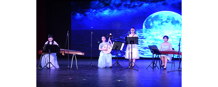 由胡箭、魏菀老师和学生丁吉雨、韩玉琦共同演绎的民乐小合奏《彩云追月》,让观众们陶醉到古典音乐中,领略到经典曲风的魅力。