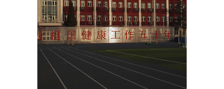 蓝色跑道旁“为祖国健康工作五十年”的口号