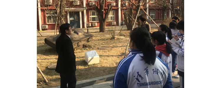 之后,朱建宏带领大家来到位于校园中轴线上的《日晷》雕塑前。他让同学们看《日晷》下部底座镌刻着“行胜于言”的中文及阿拉丁文,介绍道“行胜于言”是清华的校风,而正是这一校风使清华培养大批脚踏实地、奉献报国的优秀人才。