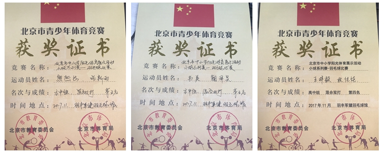 2017年11月5日,北京市中小学阳光体育展示活动小球系列赛——羽毛球比赛(简称阳光杯)在朝阳区羽丰军健羽毛球馆开赛。澳门博彩在线奥森校区羽毛球校队派出8名选手与本部一起组成了澳门博彩在线代表队,在澳门博彩在线奥森、将台路校区执行校长朱建宏以及王潇老师、侯小龙教练的带领下,参加了高中男子单打、双打、女子双打及混合双打四个项目的比赛。