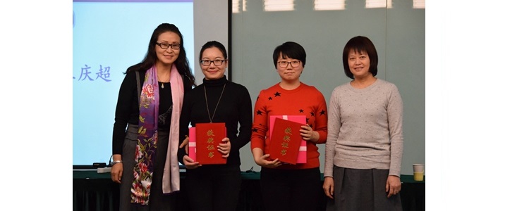 张姝敏副校长(左1)和程惠云副校长(右1)为奥森校区获得二等奖教师(左起:赵畅、王庆超)颁奖