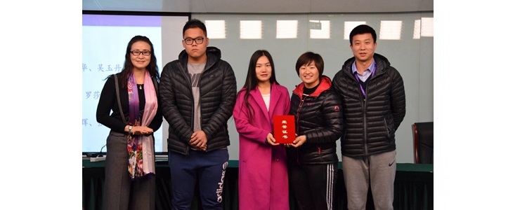 张姝敏副校长(左1)为将台路校区体育组教师(左起:冯启瑀、张玉婷、王颖辉、何先明)颁发活动设计集体奖