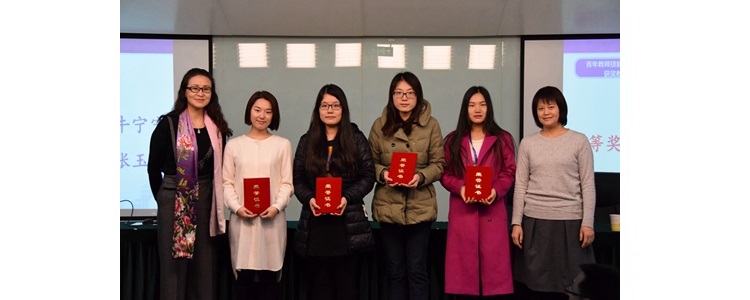 张姝敏副校长(左1)和程惠云副校长(右1)为将台路校区获得二等奖教师(左起:王籽晴、牛宁宁、张晓萌、张玉婷)颁奖