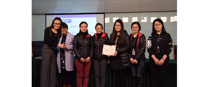 程惠云副校长(右1)为将台路校区生物通技组教师(左起:石静静、龚玉新、罗莎)颁发活动设计集体奖
