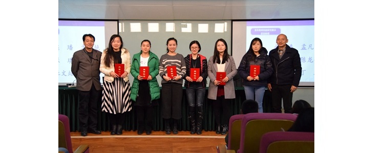 崔启发主任(左1)和陈卫东副主任(右1)为将台路校区获得三等奖教师(左起:杜文站、孟凡艳、赵璠、张琪、陈龙敏、丁瑗)颁奖