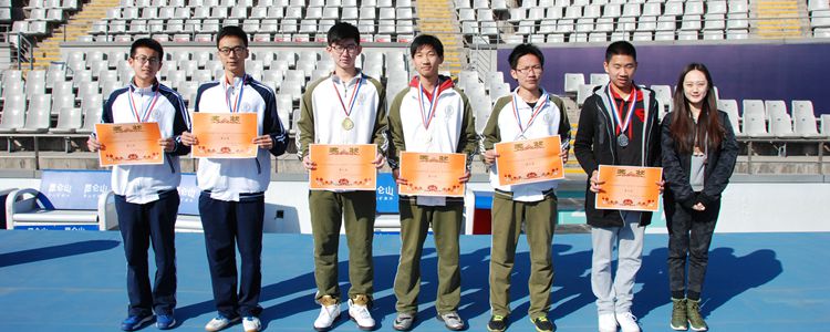 张原野老师(左1)、李墨老师(右1)为混合双打获奖学生颁奖