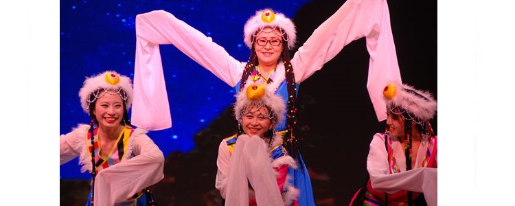 张姝敏副校长(后排)、胡箭(前排左)、李墨(前排中)、张译文(前排右)老师表演歌舞《北京的金山上》