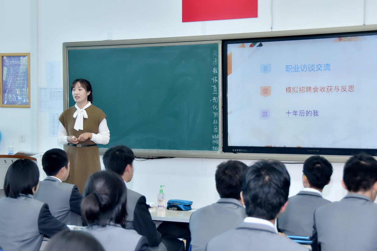 班会课上,学生们分组分享了对身边相关职业的访谈,并且针对前一天模拟招聘会的收获与反思进行了深入交流。最后,大家想象十年后的自己成为的样子,为十年后的自己做一张名片。整个班会生动有趣,气氛热烈。