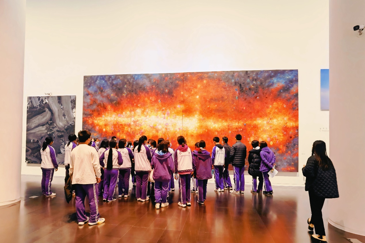 同学们一走进“存在之境:当代艺术展”展览现场,就被一幅幅当代艺术作品深深吸引,在这里,他们欣赏到了水墨、油画、雕塑、影像、装置和行为艺术作品。浓厚的艺术气息,使他们驻足画前,仔细观察作品的创作内涵与形式特点,认真听取讲解,并向讲解老师请教艺术家的创作主题、创作过程等问题。学生在观看当代艺术作品的过程中,相互讨论,主动探索当代艺术具有时代特征的典型主题、以及艺术中的可能性。