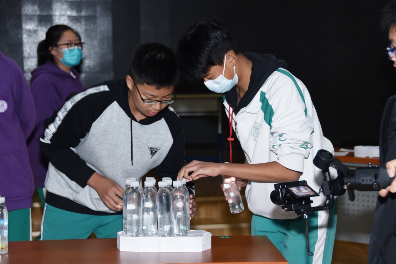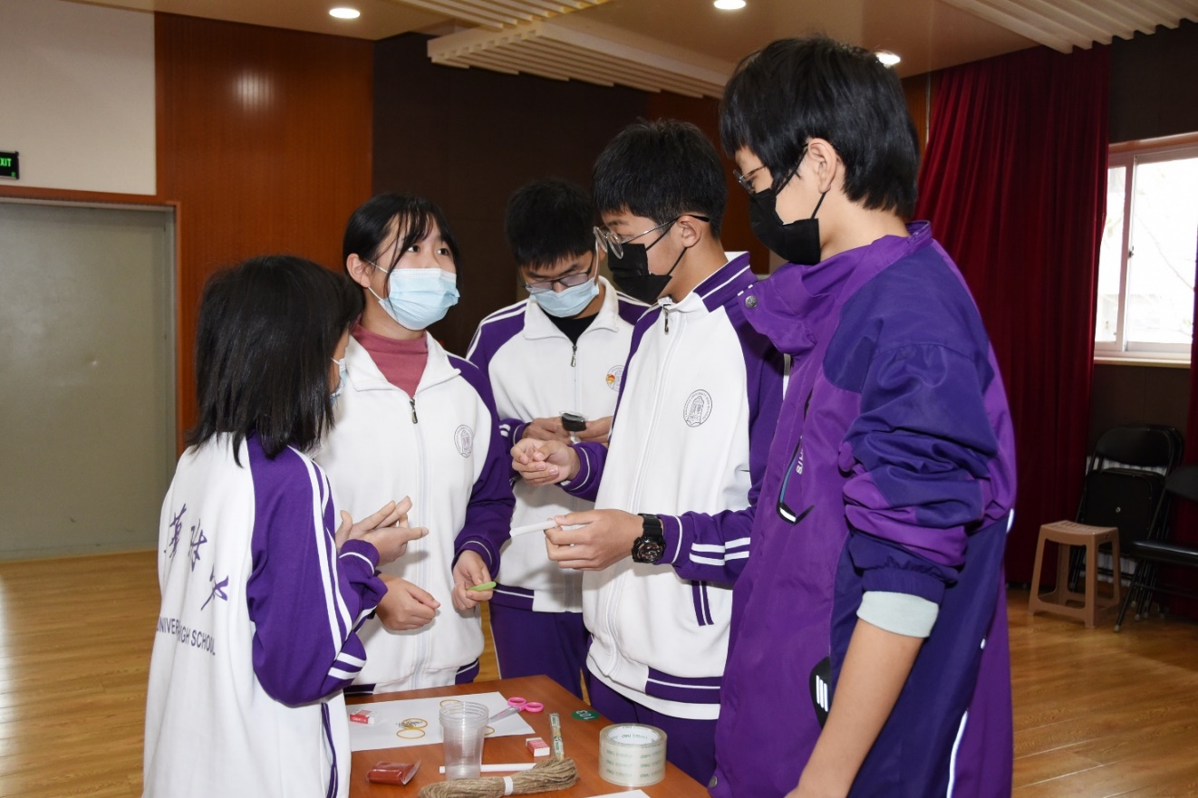 11月17日中午,高一年级学生在多功能厅开展了“自动升旗装置”活动。此装置的原理是利用定滑轮和杠杆原理,定滑轮可以改变力的方向,杠杆可以改变力的方向同时还可以省力,模拟升旗。学生在激烈讨论后设计出实施方案,画出草图,合作制作了一个个用吸管和筷子等材料制作的自动升旗装置,经过不断改良,学生结合想象力和创造力做出了奇妙的物理模型,在探索中体验到了科技的快乐。