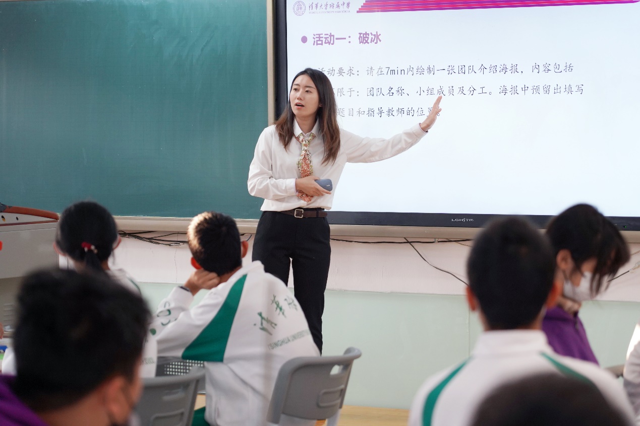 导引课由生物组的罗莎老师进行讲授,包含四个学生活动。首先通过破冰游戏,班级学生分组绘制团队介绍海报,在活动中形成团队意识,提高凝聚力。随后,通过分析生态系统碳循环的过程,明确CO2含量上升的主要原因。紧接着,带领学生认识碳中和,理解碳中和的含义,建立实现碳中和的技术框架。最后组织学生讨论“如何设计碳中和方案”,让学生明确感兴趣的研究话题,在海报上绘制项目研究框架。
