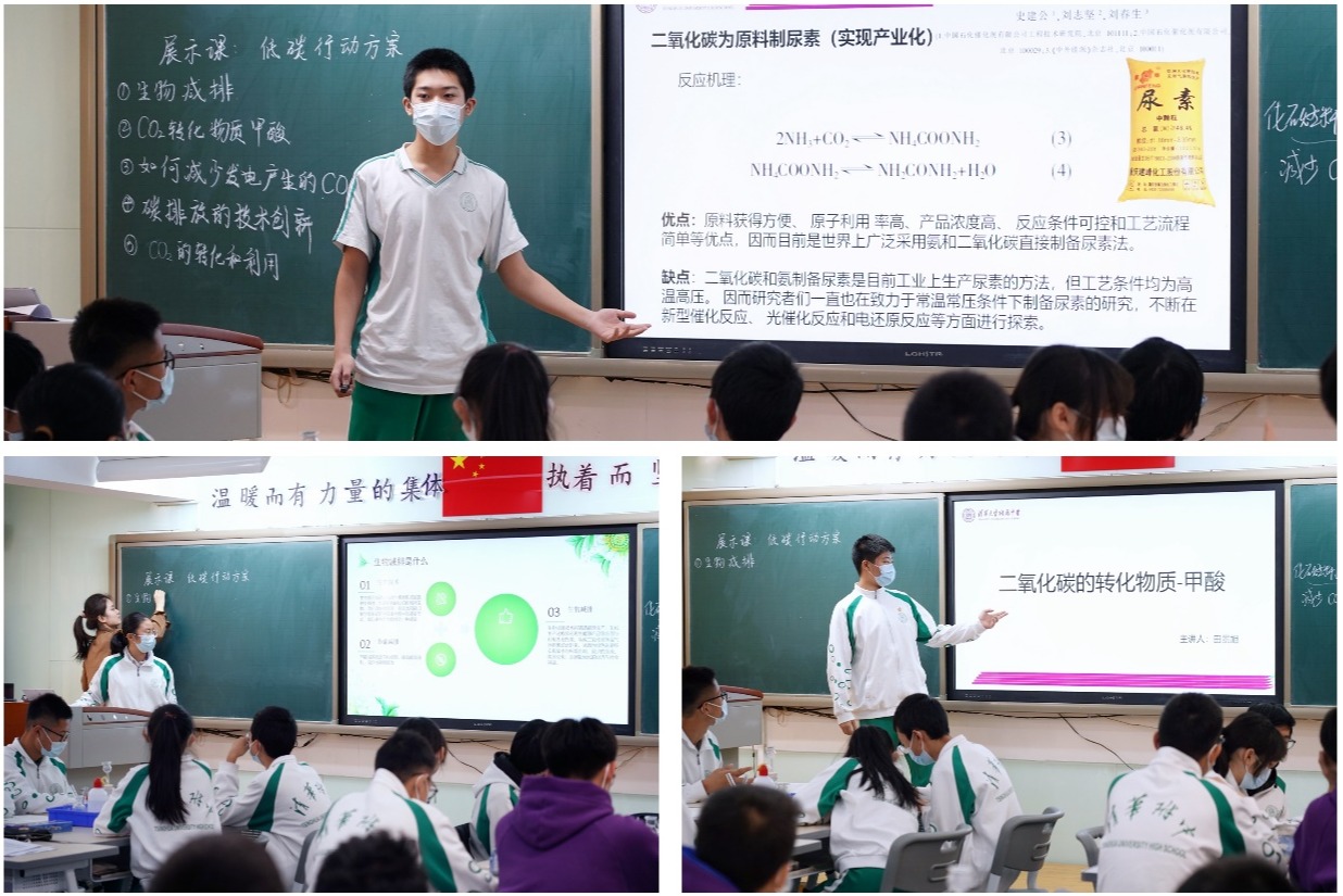 探究课3由化学组党文萍老师进行讲授,共分为四个学生活动。首先,探寻设计低碳行动方案;随后,通过阅读资料了解目前已有的碳捕获和碳封存技术,讨论收集利用并高效转化利用CO2。的方法;最后,老师借助“我要碳中和”及“低碳星球”两个小程序的计算和使用,组织学生讨论“实现碳中和,国际在推动,中国在行动,个人该怎么做?”的问题,让学生深刻体会到个人日常的低碳行为会给碳中和做出的巨大贡献。