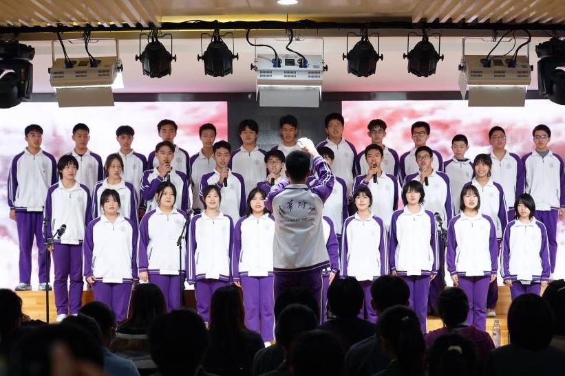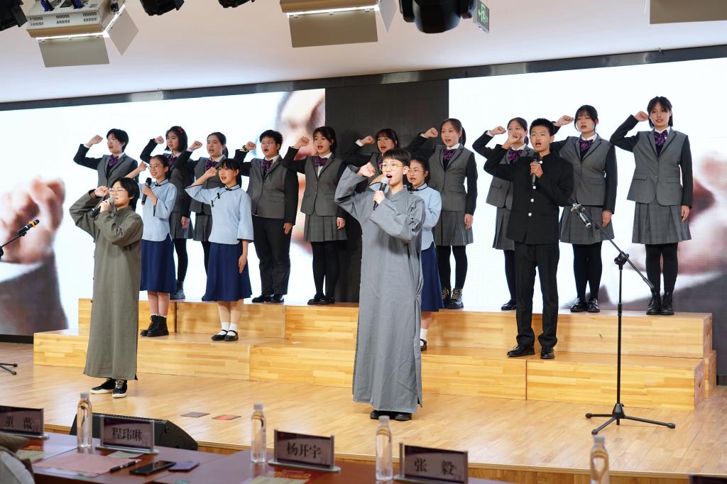高一(4)班带来了演唱《歌唱祖国》,高昂的歌声展现出学生作为新时代青年对祖国的深深眷恋,以及对中国共产党人用赤诚初心担起伟大使命,带领中国经历血与火的洗礼,成为当今这个崭新繁荣模样的感恩。