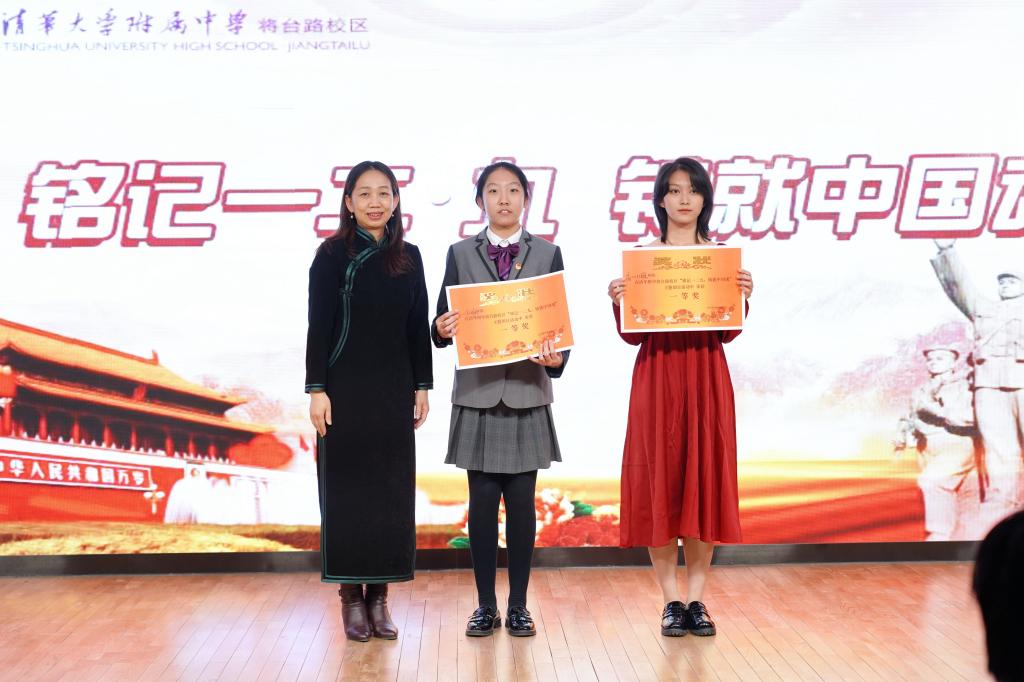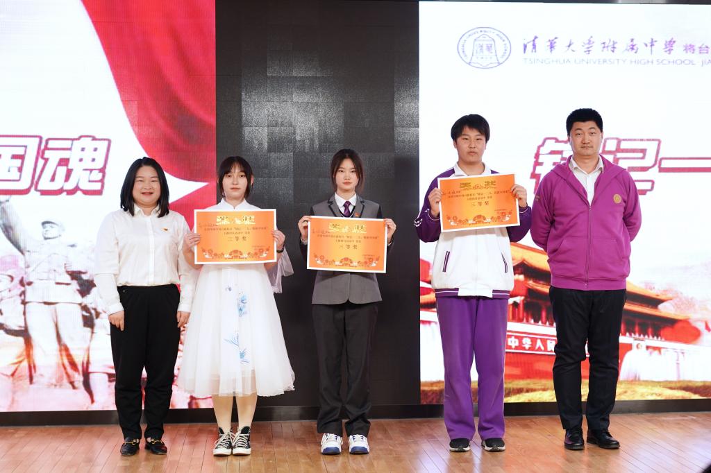 程玮琳副主任(左1)、杨开宇副主任(右1)为获得三等奖的班级颁奖