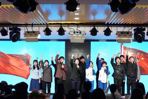 高二年级代表带来了演出《穿越时空的信仰》,同学们用精巧的构思,多样的表现手法及忘我的精湛演技,在一方小小舞台之上,跨越万水千山与厚重的历史和革命前辈对话,感悟那豪迈深沉的民族气节与激荡昂扬的爱国斗志。