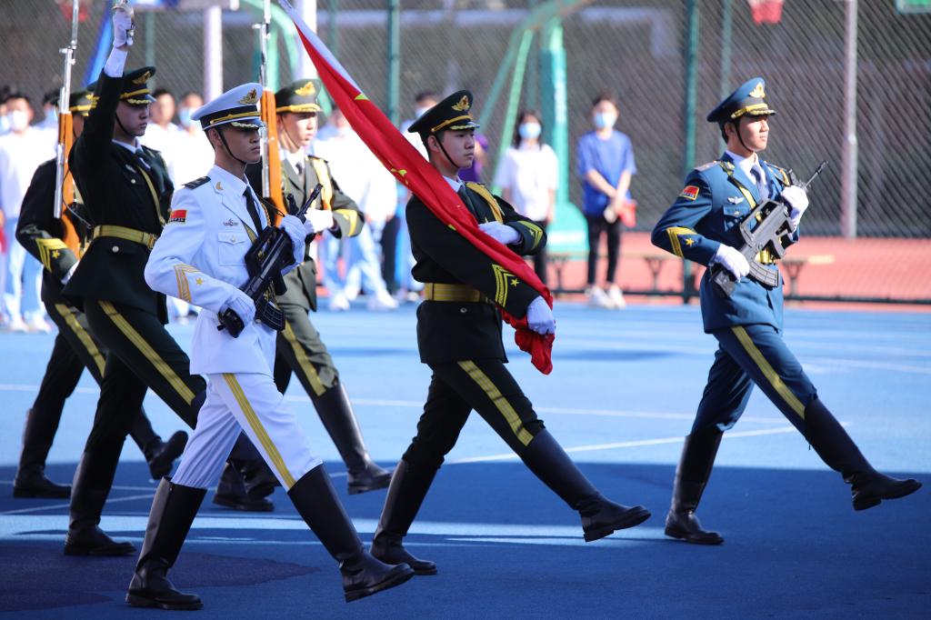 典礼伊始,庄严的国歌由校管乐团奏响,五星红旗冉冉升起,全体师生奏唱国歌。