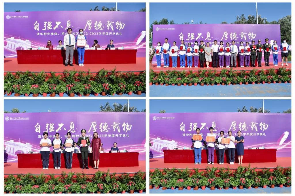 副校长张姝敏、吕宏娟、董薇与学生发展中心副主任陈卫东分别宣读了奥森、将台路校区2021-2022学年度表彰名单。领导、嘉宾为获得海淀区、朝阳区优秀团支部,优秀学生干部、校级三好学生、先进班集体、优秀毕业生代表及各项文体竞赛的获奖者颁发荣誉证书。