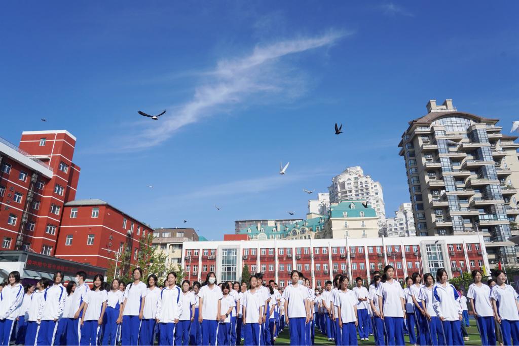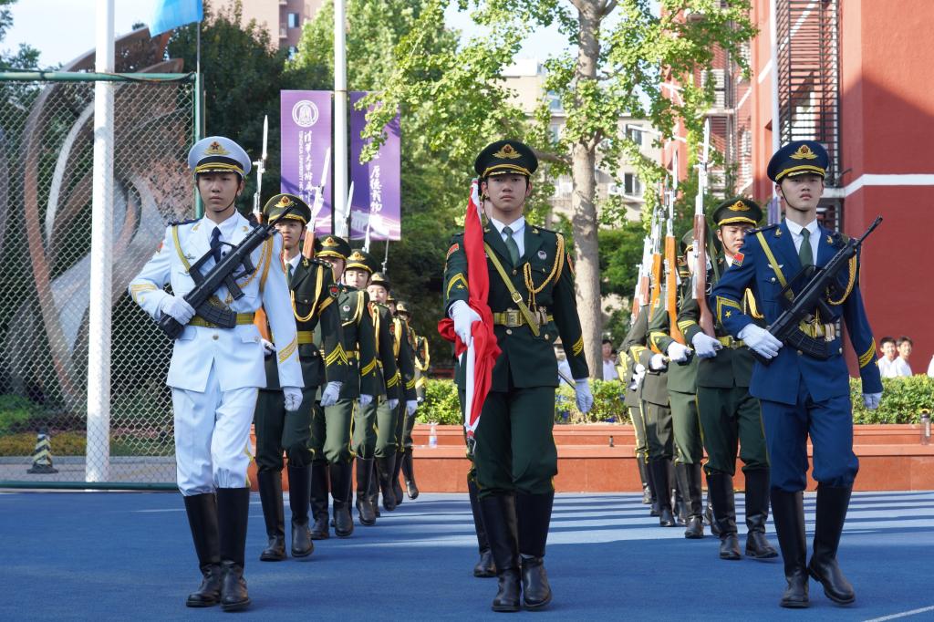 典礼伊始,两校区国旗班迈着整齐的步伐进入操场。五星红旗冉冉升起,全体师生一起唱响国歌。