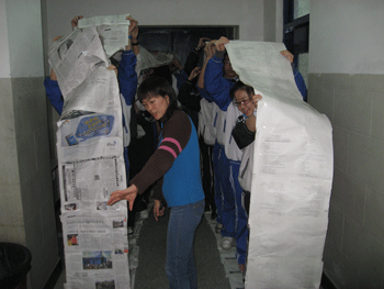 在“大风吹”等热身游戏中,同学们欢笑一堂,彼此熟悉,也展现了同学们的智慧。随后陈老师指导大家进行了团队间的“坦克大战”。同学们被分为五个团队,活动规则之每个团队要利用一定量的报纸和胶带制成一个简易的履带,团队中的每位队员都要站在履带中,全体队员靠手脚来推动履带前进,最先到达终点的团队胜出。在制作履带的过程中,每位成员都充分运用自己的聪明才智和动手能力,充分展现出了团队精神。随后的比赛过程则十分激烈,三、四两个团队的小组赛更是充满了火药味,你争我赶,唯恐落下,“1,2;1,2”的加油口号声此起彼伏,队员们齐心协力一起向前冲,第三团队的绝佳配合让他们取得了最后的胜利。