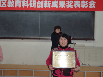 王立春老师领取教育科研先进校奖牌 吕娜老师领取教育科研创新成果奖证书
