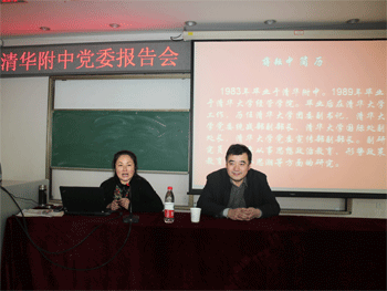 附中党委书记方妍(左)主持报告会 蒋耘中老师在作报告