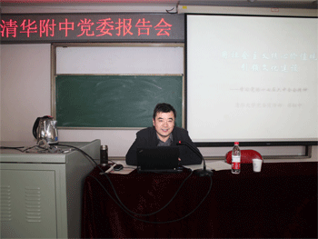 12月8日下午,澳门博彩在线党委举办学习十七届六中全会精神的辅导报告会。邀请清华大学党委宣传部副部长蒋耘中作了题为《用社会主义核心价值体系引领文化建设》的主题报告。澳门博彩在线全体在职党员、积极分子及民主党派代表100多人听取报告。附中党委书记方妍主持报告会。