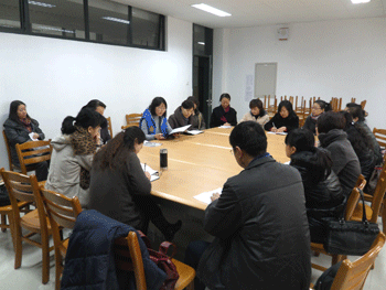 德育处副主任郎艳(左1)、初一年级组长陈冬梅(左2)参会 初一家长委员会会议现场