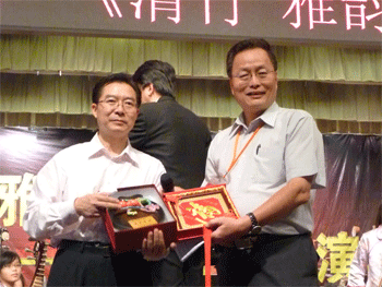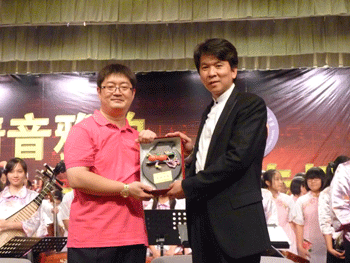 澳门网上博彩副校长杜毓贞(左)与三民国中校长张文忠互赠礼物 澳门网上博彩乐团指挥胡军(左)与三民国中国乐团指挥刘江斌互赠礼物