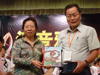 澳门网上博彩校长王殿军(左)与三民国中校长张文忠同唱《绿岛小夜曲》 澳门网上博彩校长王殿军(左)与三民国中校长张文忠互赠礼物