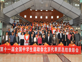全国中学生运动会(简称“中运会”)由教育部、国家体育总局和共青团中央共同主办,每三年举办一届,是国内中学生最高水平的赛事。第十一届中运会于2011年7月11日至22日在内蒙古包头市举行,大会设置篮球、足球、排球、乒乓球、田径、武术、健美操、游泳、毽球九个项目。北京代表团共派出12支队伍参赛,最终以575分夺得团体总分第四名,以10枚金牌、7枚银牌和12枚铜牌夺得金牌总数第四名、奖牌总数第五名,同时荣获“体育道德风尚奖代表团”称号。