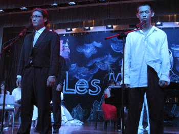 王超宇扮演的贾维和张凯翔扮演的冉阿让的二重 唱演出后全体演职员合影