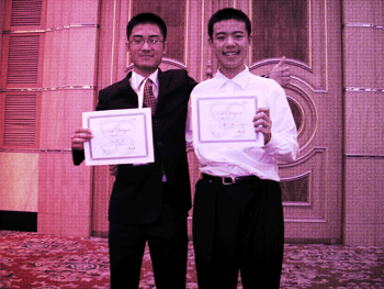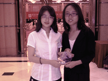 澳门博彩在线获奖学生张悠南(左)、魏勐 澳门博彩在线模联主席段嘉懿(左)与复旦附中学生领队牛竞瑶