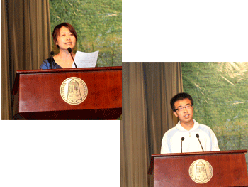出席毕业典礼的领导为获奖班级和学生颁奖 教师代表(左)和毕业生代表分别发言