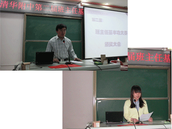 校领导为获奖者颁奖 获奖班主任代表张波(左)、黄珊发言
