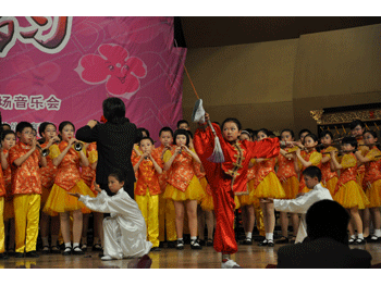 胡军老师向清华附小介绍附中办团经验 附小吹打乐团演奏名曲《将军令》附小武术 队参与演出