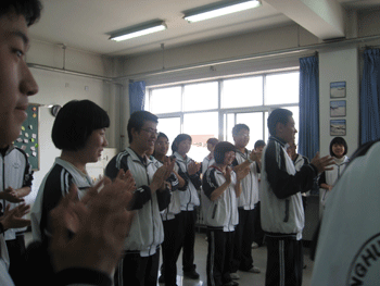 活动开始后,每一轮活动中,同学们需要按陈老师的口令来完成相应的动作,尽量不要出现错误。如果组员犯错则组长需要做一定数量的俯卧撑作为惩罚,惩罚的个数视轮数及犯错次数而定。同学们都小心翼翼,尽量不出错误,但也难免出现个别小错误。当组长在“接受惩罚”的时候,组员都为他加油鼓掌。五轮比赛结束后,每位组长都做了超过160个俯卧撑。但是三名组长毫无怨言,都表示愿意承担自己的责任,也有不少组员主动陪伴组长共同受罚,场面温馨而欢快。