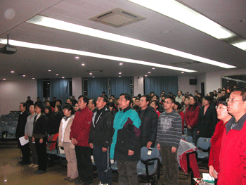 第八届教代会在国歌合唱声中开幕 党委书记方妍主持(左) 校长王殿军做工作报告